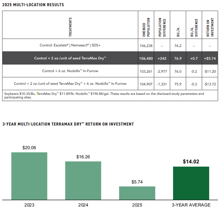 With a suggested MSRP of just $1.48 per bag of seed, TerraMax Dry is not only effective, it’s also one of the most affordable seed treatments on the market.